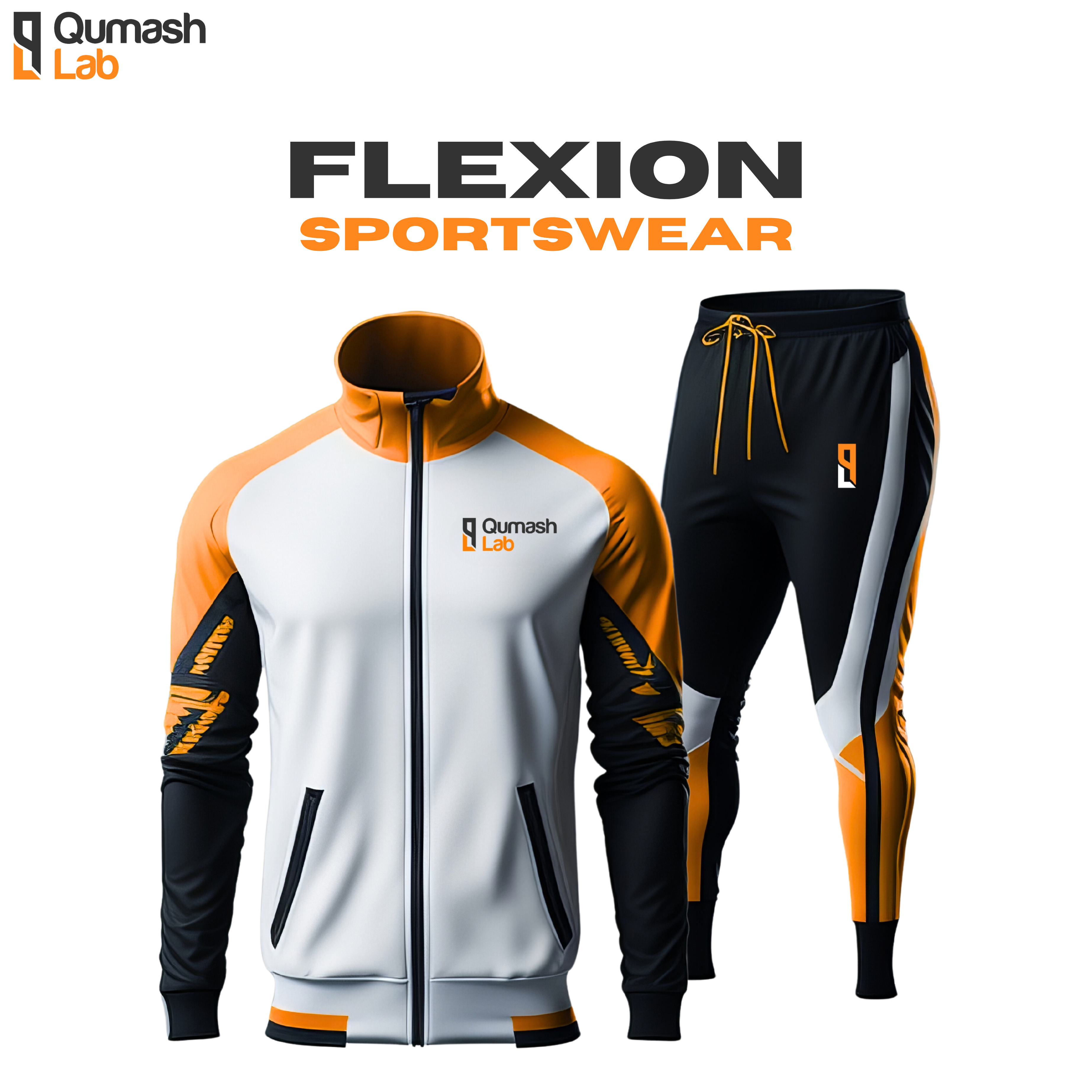The QumashLab "Faith" Tshirt combines comfort, durability, and bold design, crafted from an 100% polyester that uses printing technique, perfect blend for softness and resilience. This features a sleek and modern sportswear set branded as "Flexion Sportswear" by Qumash Lab, consisting of a jacket and matching pants made from smooth, athletic fabric, likely designed for comfort and performance. The jacket showcases a white base with vibrant orange shoulders, black accents on the sleeves, zippers, and cuffs, and sporty black patterns with orange highlights, complemented by the "Qumash Lab" logo on the left chest. The pants feature a black base with white and orange side panels, an elastic waistband with orange drawstrings, and tapered ankles with elasticated cuffs, along with the logo printed on the left thigh for cohesive branding. The bold and energetic color scheme of white, orange, and black, combined with functional elements like zippered pockets and a snug fit, makes this set ideal for athletes and casual wearers, emphasizing flexibility, style, and performance.! Available in sizes S, M, L, XL, and XXL to ensure the perfect fit. Designed for style and comfort, it's a standout addition to any wardrobe.